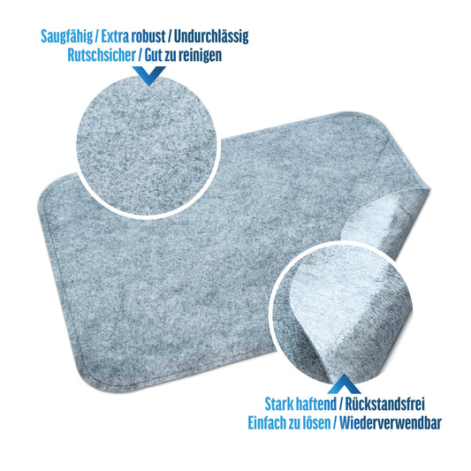 HomeProtect® ist eine einzigartige Schutzmatte mit einer Dicke von nur 2 mm, was ihre vielseitige Anwendung ermöglicht. Dank ihrer äusserst robusten und saugfähigen Vliesoberseite nimmt sie effektiv Flüssigkeiten und Schmutz auf und schützt deine Oberflächen vor Beschädigungen. Die selbstklebende undurchlässige Folienunterseite erlaubt eine grenzenlose Nutzung und kann jederzeit rückstandsfrei entfernt werden.